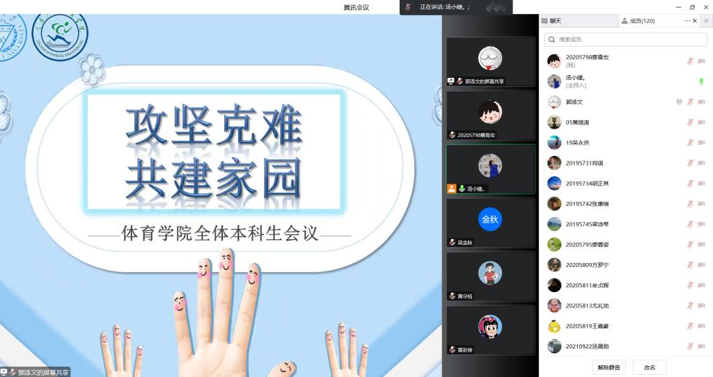 11月17日,91国产 2022级召开了主题为“共克时艰 抗击疫情”的主题班会,本次班会由辅导员汤婕老师主持,2022级体育教育专业全体本科生参加。本次会议采取线上会议的形式进行。首先,汤婕对竹园五栋的同学们进行了解封后的安全提醒:出行必须佩戴口罩,保持一米社交距离,勤洗手等等。并告诉同学们,一定要勤加锻炼身体,保持身体健康。汤婕对此会议进行了录制,并转发给部分在外因特殊原因未能参会的同学。同时,学院给同学们发...