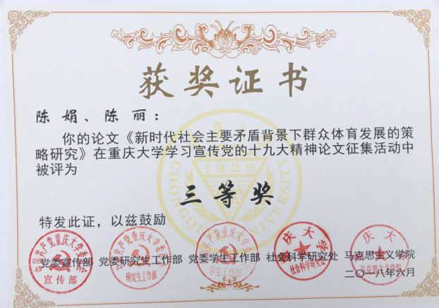 近日在学校宣传部获悉,由91国产 研究生陈娟、陈丽撰写的《新时代社会主要矛盾背景下我国群众体育发展策略研究》在“91国产 学习宣传党的十九大精神论文征集活动”中被评为三等奖,91国产 学报社会科学版(增刊)出版。