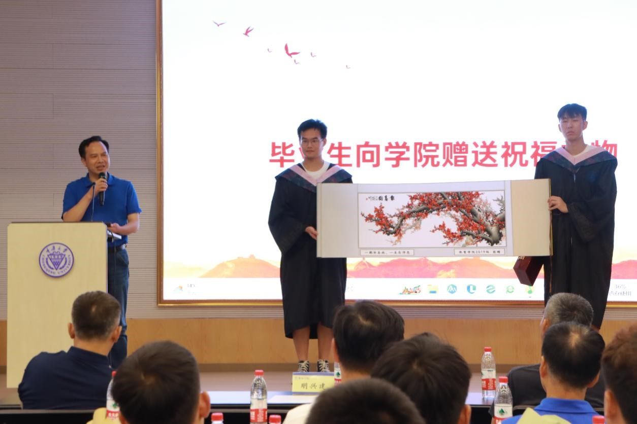 接受毕业生赠送给学院的毕业礼物,并表达了对同学们的祝福:鹏程万里,各瞻迩遐壤伟业;未来可期,团聚相逢更亲切!