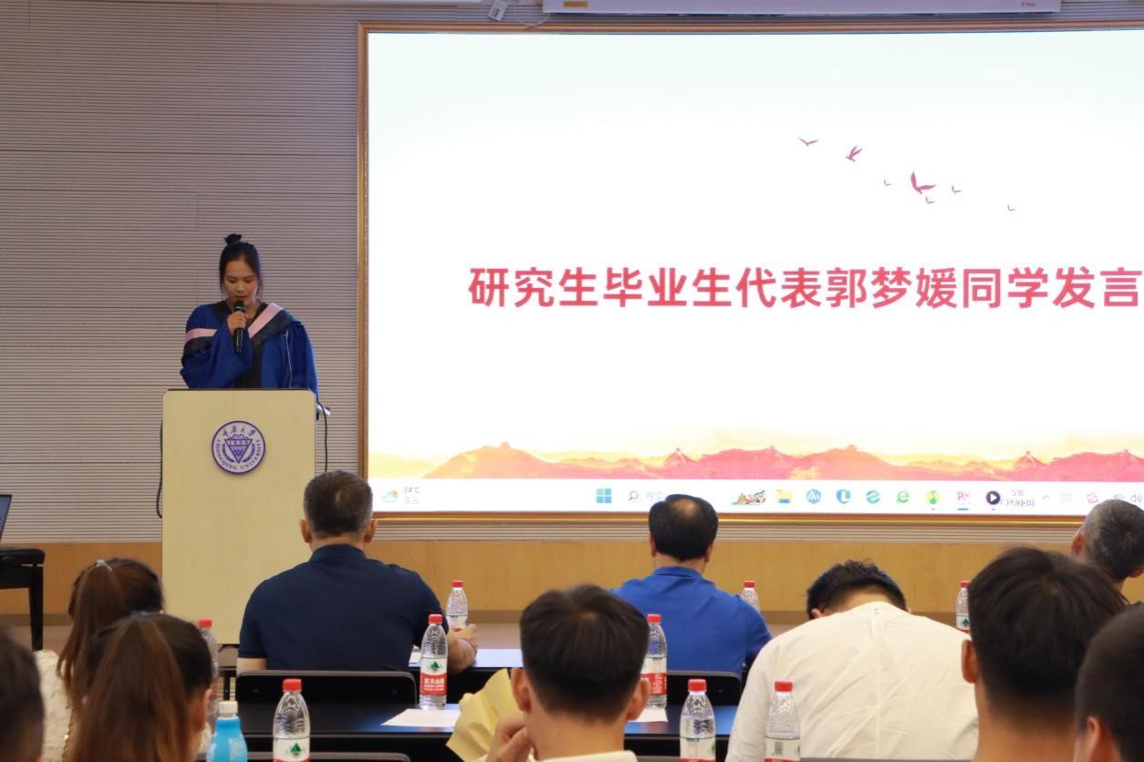“让我们带着我们的梦想,带着我们的希望,带着我们的决心,去迎接新的挑战,去创造新的辉煌;让我们永远保持对知识的热爱,对人生的热情,对世界的好奇;让我们永远保持勇敢,永远保持谦虚,永远保持善良”。毕业研究生郭梦媛同学在发言中发表了对自己以及同学的美好期许与鼓励。祝愿每位毕业生能够在自己的领域发光发热,做出应有贡献。