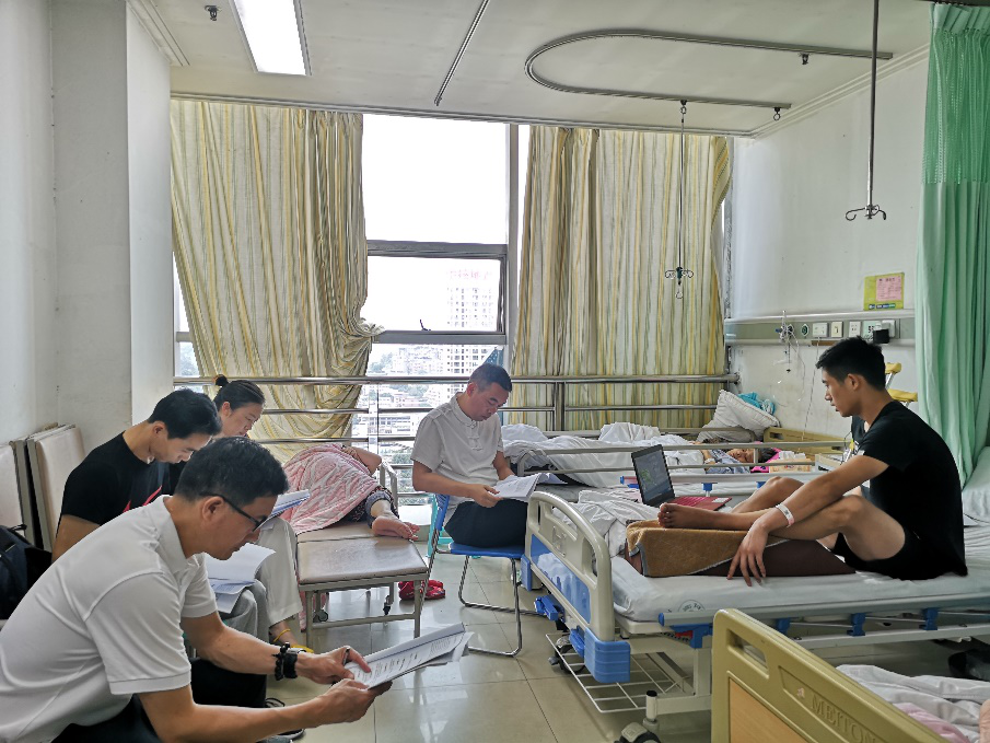 值得一提的是,在集体答辩结束后,由于毕业生张超明同学前几天参加羽毛球比赛跟腱拉断,受伤住院,学院领导和答辩委员会经过商量讨论,决定抽调四名答辩专家到学生住院病房给张超明同学现场答辩。随后在中午一点,张超明同学的病房出现了老师和学生在医院病房进行学生毕业论文答辩的一幕。