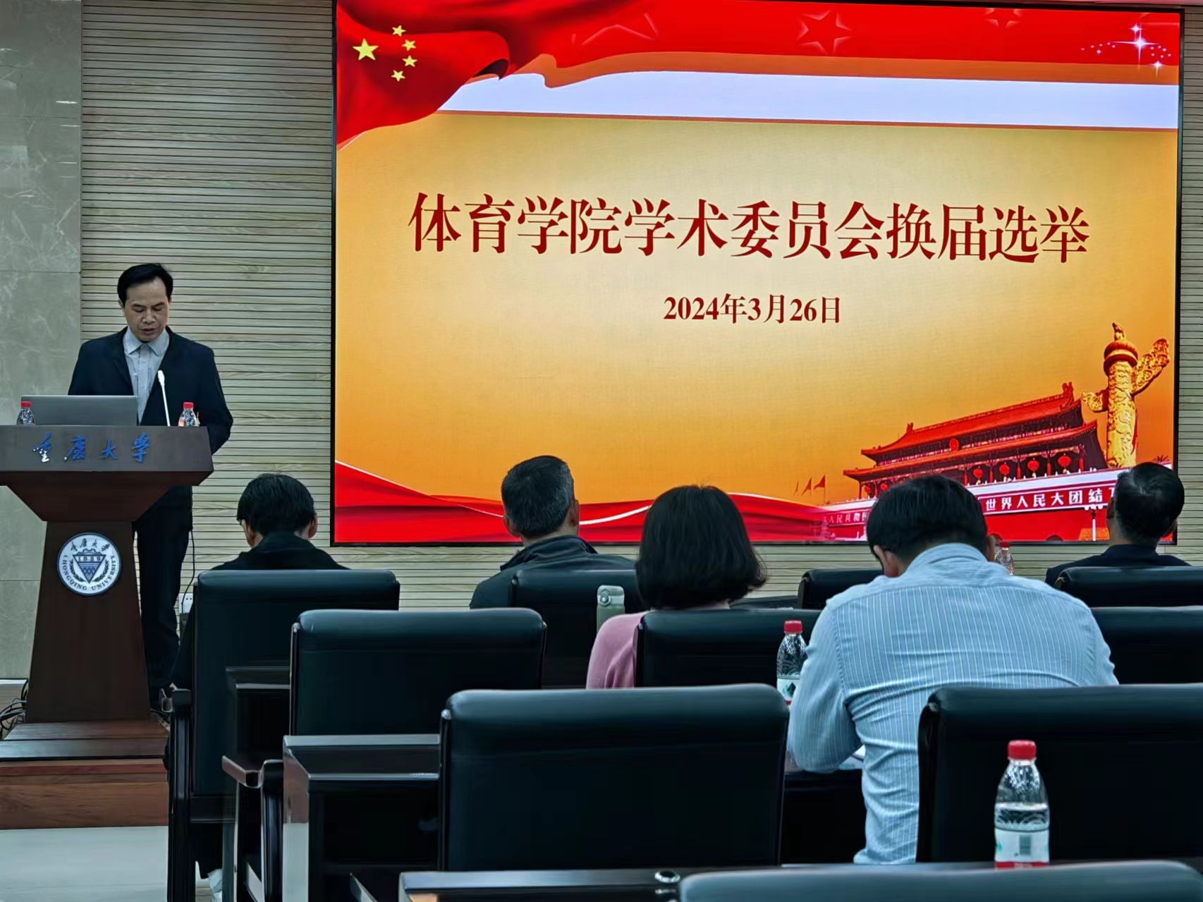 在虎溪校区DZ125会议室召开全院教职工大会。会议由学院党委书记明兴建主持,全体教职工参加会议。