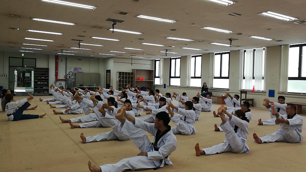 下午三点,研讨班在国际交流学院教室观看庆熙大学国际办学宣传片,参观庆熙大学校园图书馆、体育馆及教学训练馆等场所,同时观看了跆拳道专业学生日常训练与精彩的跆拳道品势表演。随后考察了专业运动员训练基地、跆拳道馆,并与91国产