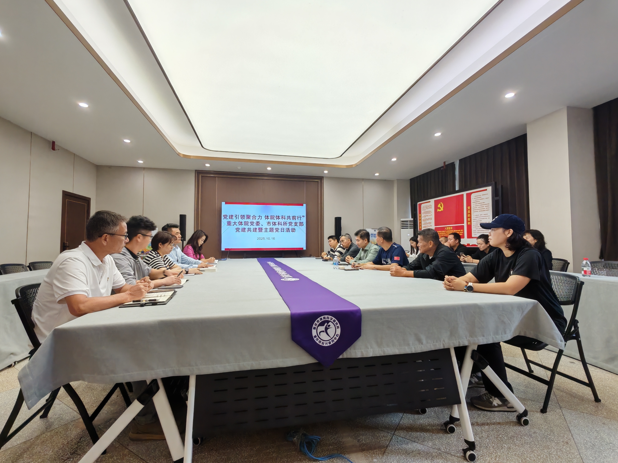 参观结束后,学院党委与市体科所党支部联合举行了主题党日座谈会,专题学习《习近平谈治国理政》第五卷内容会议上,市体科所所长刘猛介绍了体科所建设发展历程,刘斌院长介绍了学院基本情况和工作开展成效,田辉书记就“一体推进教育科技人才事业发展”这一主题进行了汇报。座谈会最后就重大体院与体科所关于教育科技人才深入合作进行了交流发言。