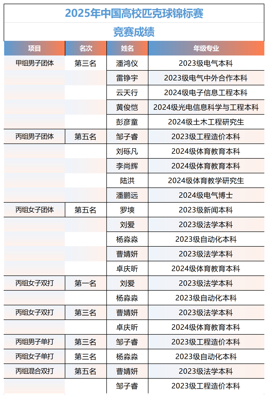 作为国内规模最大、规格最高的高校匹克球赛事,校学子在本届锦标赛1金4铜的佳绩收官,展现强劲实力与青春风采。