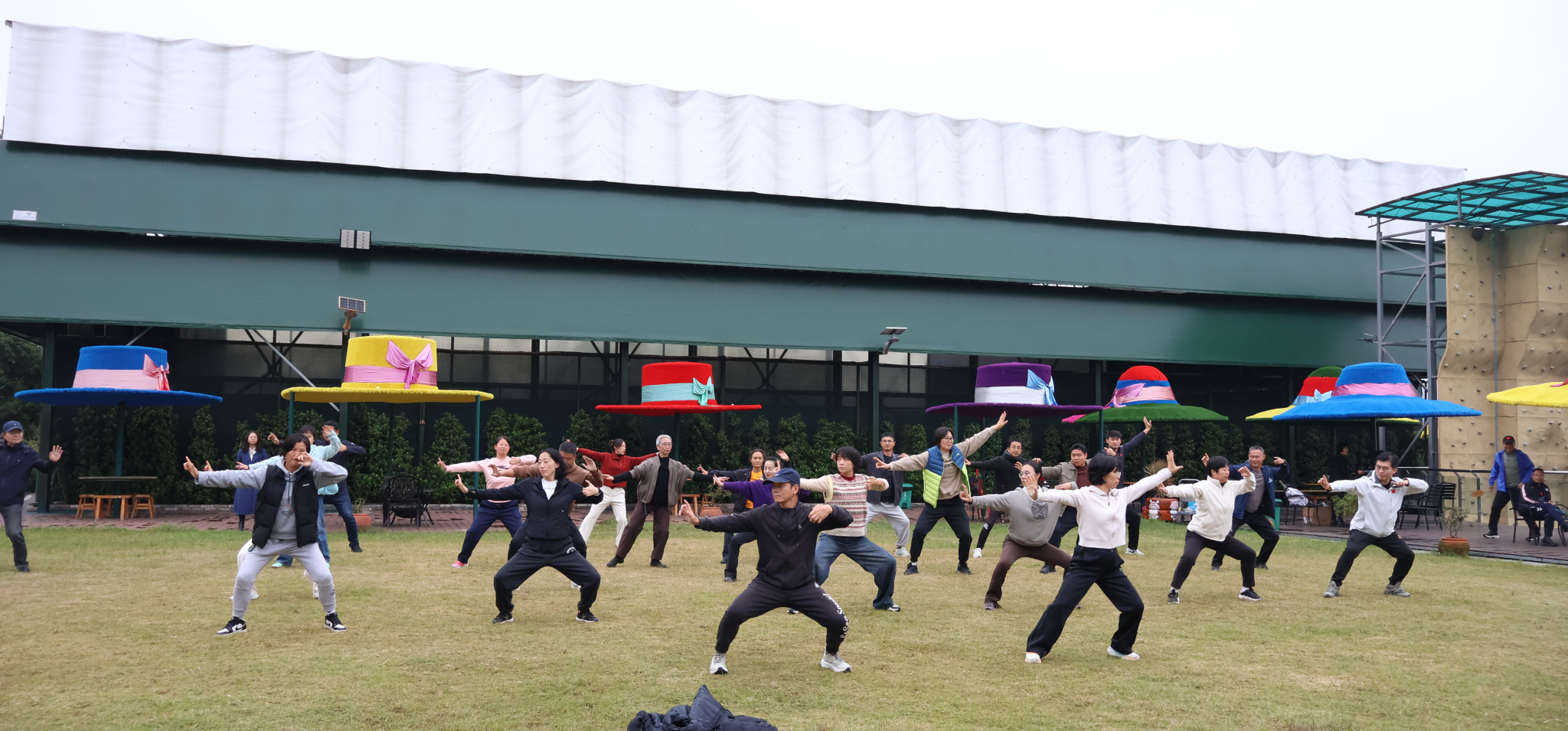 随后,队伍转场至风景如画的大渡口小南海地球村,开启了活力四射的体育健身环节。活动伊始,在专业老师的带领下,全体教职工集体练习了中华传统养生功法“八段锦”。大家动作舒缓、意守丹田,在宁静的自然环境中调理身心,充分感受中华传统体育文化的魅力。