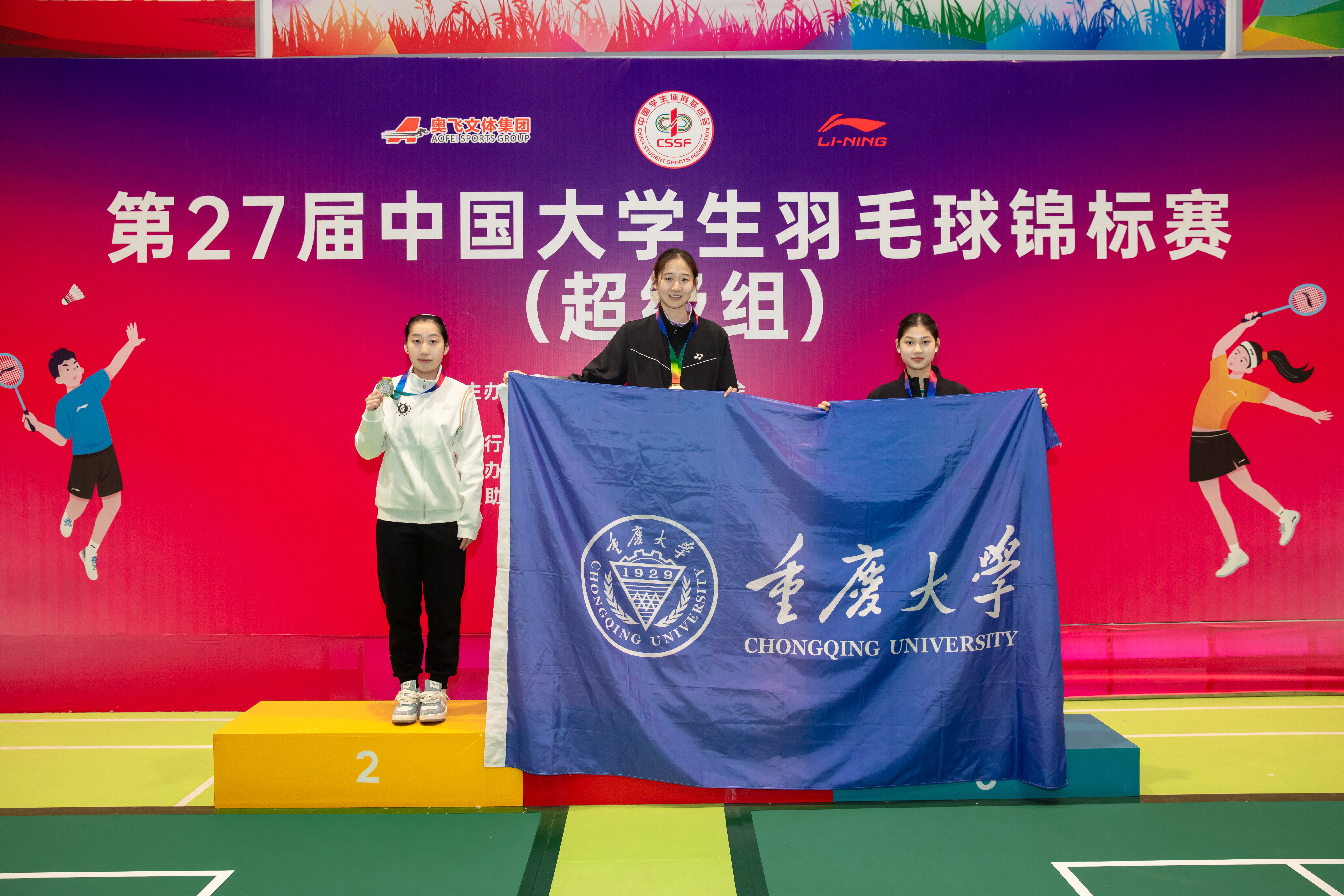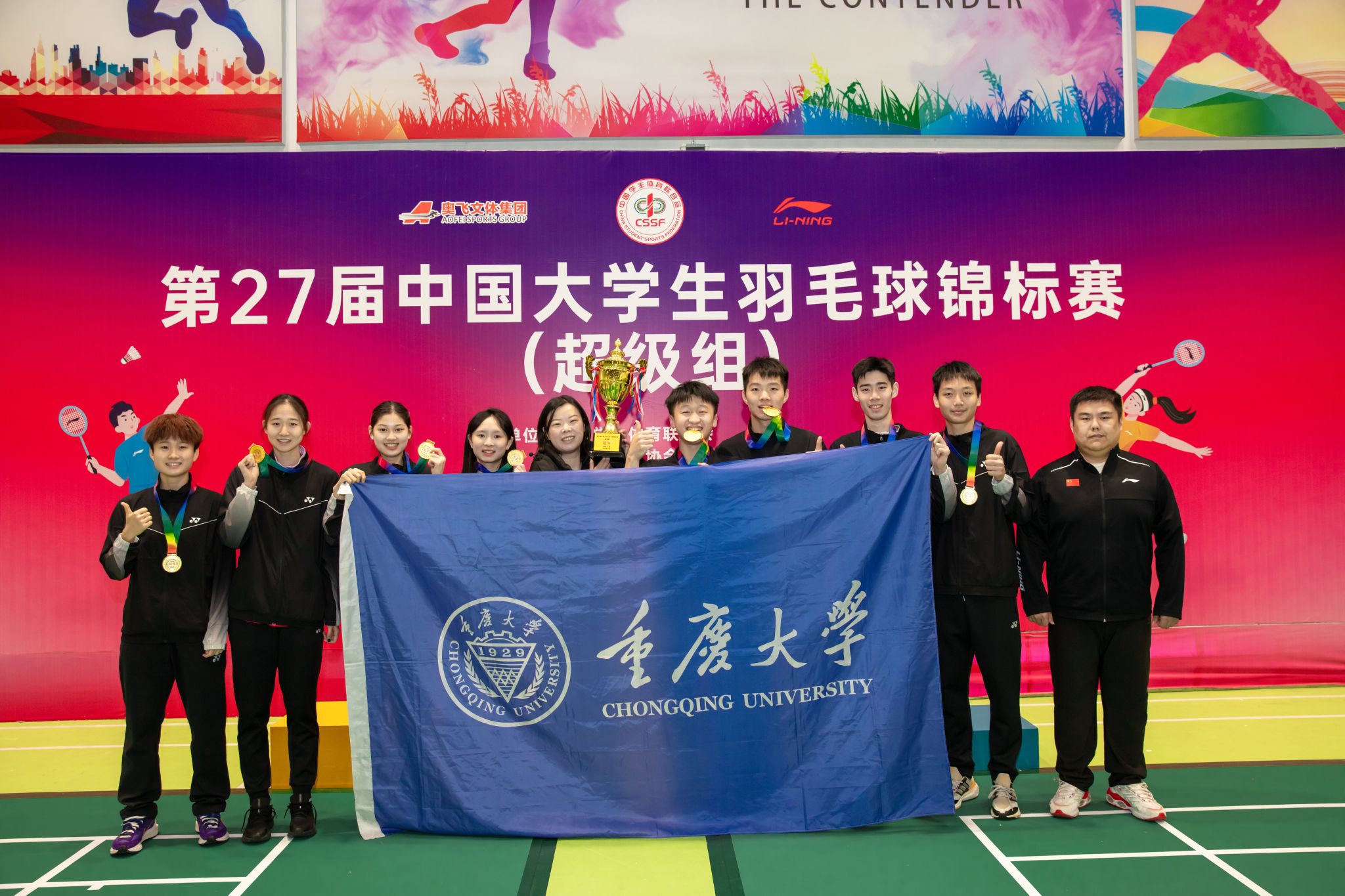 在混合团体赛中,由章宁、高博帅、贾之凡、王紫涵、林一凡、陈喆涵、詹景云、姜婧、黄林苒、余永桢10位2025级运动训练专业学子组成的队伍,在强手如林的团体赛中一路过关斩将。她们在小组赛惜败西南大学,力克强敌,以小组第二的名次进入淘汰赛,半决赛战胜华南理工大学,在决赛中再次与卫冕冠军西南大学相遇,以3:1的大比分成功问鼎冠军,将象征全国高校羽毛球最高团体荣誉的奖杯带回山城重庆。