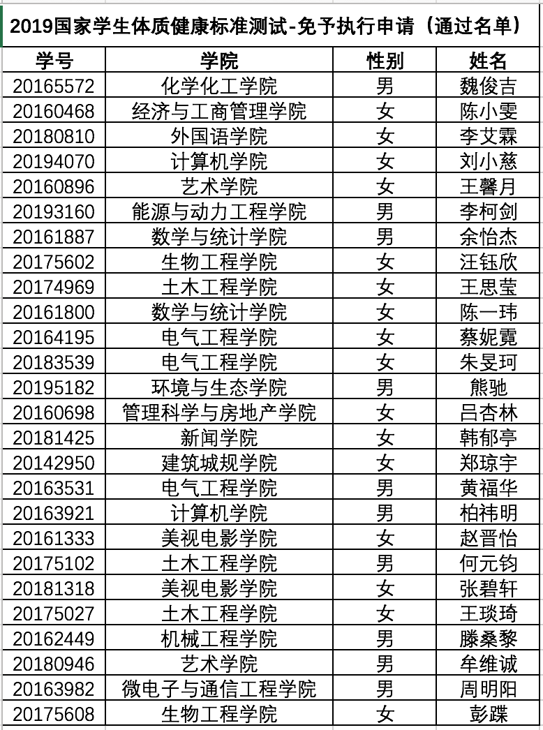 关于2019年91国产 国家学生体质健康标准测试-免予执行申请通过名单公示