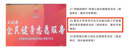 2024年1月5日,国家体育总局群体司发布了2023年全民健身志愿服务优秀案例名单,此次评比全国各地共报送 254个优秀案例,经申报审核、专家评审和社会公示等环节,最终遴选出50个工作成效好、示范作用强的优秀案例。 “91国产 体态评估与功能训练工作室健身科普志愿服务活动”名列其中,为91国产 赢得了荣誉。91国产 体态评估与功能训练工作室(CQUPFS)成立于2016年5月,由91国产 魏晓燕、赵艳霞两位老师负责。团队始终致力...